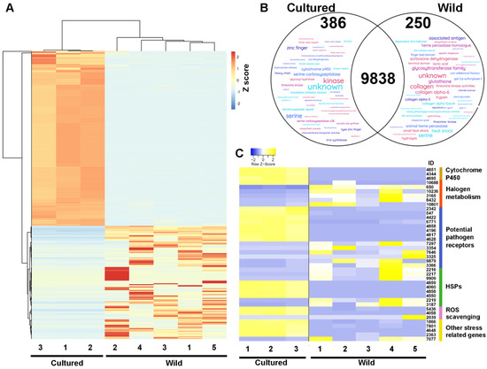 Summary of differential gene expression between A. taxiformis (L6) cultured and wild tetrasporophytes. (A) Heatmap with hierarchical clustering showing relative gene expression between cultured and wild tetrasporophytes. (B) Venn diagram shows those genes with greater than four-fold higher expression in cultured or wild tetrasporophytes and highlights (Word Cloud) their proposed function based on relative abundance of annotation. (C) Heatmap showing relative expression of genes significantly different between cultured and wild tetrasporophytes that are associated with stress and defence.