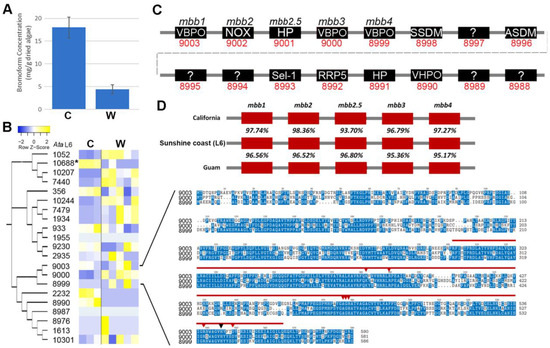 Comparative sequence analysis of PAP2/VHPOs in A. taxiformis (L6). (A) Bromoform concentration measured in the tetrasporophytes of cultured (C) and wild (W) A. taxiformis. Values correspond to mean % dry weight ± standard error (n = 3). (B) Phylogeny of vBPO genes and their relative level of gene expression (TPM log2) in cultured and wild A. taxiformis sporophytes. An asterisk (*) indicates significantly different (p < 0.05) and >4 FDR fold-change. Multiple sequence alignment shows VBPO protein sequences. The PAP2 domain is highlighted by the bold red line, and the red arrowheads point to active site residues. The black arrowhead denotes a histidine proposed to covalently bond to the vanadate cofactor [34]. (C) Schematic showing genomic organization of contig 5424 containing the mbb gene cluster in A. taxiformis (L6). This gene cluster includes a novel fifth gene within the mbb locus (AtaL6 9001) of uncharacterised function. VBPO, vanadium-dependent bromoperoxidase; NOX, NADPH oxidase; HP, hypothetical protein; SSDM, site-specific DNA-methyltransferase; ?, unknown function; ASDM, adenine-specific DNA methyltransferase; VHPO, vanadium haloperoxidase-like; Sel1, Sel1-repeat containing protein; RRP5, rRNA biogenesis protein 5. (D) Comparison of A. taxiformis (L6) mbb locus to those of the other two A. taxiformis lineages with available genome sequence data.