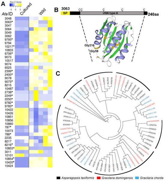 Identification and comparative analysis of Asparagopsis taxiformis (L6) rhodophyte VWA domain-containing proteins. (A) List of rhodophyte VWAs and their relative levels of gene expression (TPM log2) in cultured and wild tetrasporophytes. The asterisks (*) and the plus symbol (+) indicate significantly higher expression (p < 0.05) in wild and cultured samples, respectively, and with >4 FDR fold-change. (B) Schematic showing organisation of AtaL6 3063 and its basic protein structure. SP, signal peptide; vWA type A, vWA type A domain. (C) Phylogenetic tree of rhodophyte VWAs identified in A. taxiformis (L6), G. chorda, and G. domingensis. Seven clusters that include A. taxiformis (L6) are shown.