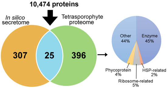 Venn showing in silico secretome of A. taxiformis (L6) genome-derived proteins (based on SignalP and TMHMM predictions) and tetrasporophyte identified proteins, also with distribution of functional categories.