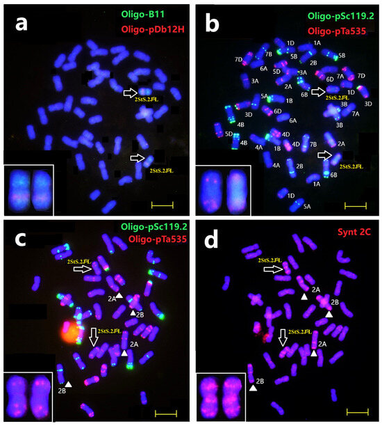 Karyotyping of the mitotic metaphase of Th93-1-6 by sequential ND-FISH and Oligo-FISH painting. Sequential ND-FISH by probes: (a) Oligo-pDb12H (red) + Oligo-B11 (green): (b,c) Oligo-pTa535 (red) + Oligo-pSc119.2 (green); and (d) Oligo-FISH by bulk painting with probes Synt2C (red), respectively. White triangles indicate chromosomes 2A and 2B; Arrows indicate chromosomes 2StS.2JSL. Bars, 10 μm.