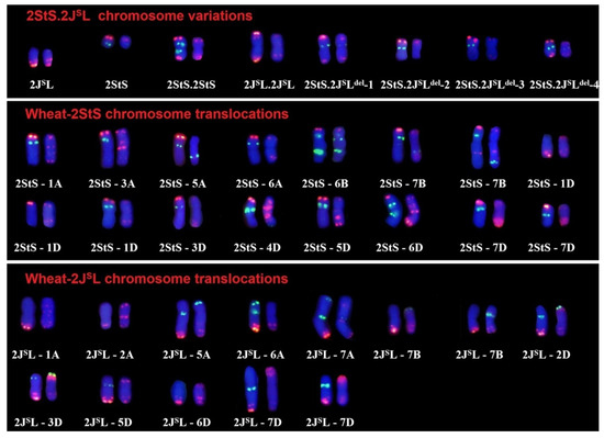 Subsequently, a total of 1823 M1 plants were recovered for karyotype analysis using probes Oligo-pSc119.2, Oligo-pTa535, Oligo-1RS-1 and Oligo-6S111. There were 431 (23.6%) individual plants that contained chromosome variations, in which 537 different types of translocations had occurred between the wheat chromosomes. The highest proportion of chromosome translocations involving the three wheat subgenomes was for B-D genomes, reaching 37.4%; the lowest was for A-A genome chromosomes at 3.2%. The typical FISH karyotypes of translocations are shown in Figure S3. Overall, 37 types of chromosomal aberrations involving 2StS.2JSL were identified, of which four carried deletions; 29 plants contained translocations (Figure 2). The remaining four variations were 2StS telosomes, 2JSL telosomes, iso-telosomic 2StS.2StS, and 2JSL.2JSL (Figure S4). These 2StS.2JSL deletions and translocations were crossed with the wheat cultivar MY11 for the later selection of homozygotes and the physical map construction.