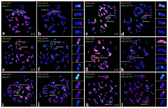 The root–tip metaphase chromosomes of all germinated seeds were prepared according to the procedure described by Han et al. [53]. The synthetic oligonucleotides Oligo-pSc119.2, Oligo-pTa535, Oligo-B11, Oligo-K288, Oligo-1RS-1, Oligo-6S111, Oligo-pSc200 and Oligo-1123 were used for ND-FISH analysis; their sequences are shown in Table S1 [44,54,55,56,57,58,59]. All oligonucleotide probes were either 5′end-labeled with 6-carboxyfluorescein (6-FAM) for green or 6-carboxytetramethylrhodamine (Tamra) for red signals. After the ND-FISH analysis of metaphase chromosomes, the Oligo-FISH painting technique was performed following the description by Li and Yang [60]. The pictures of FISH results under the Olympus BX-53 microscope were taken with a DP-70 CCD camera.