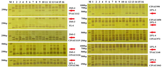 PCR amplification results of representative 2StS.2JSL-specifc markers in the twelve translocation and deletion lines: (1) Th93-1-6; (2) MY11; (3) 2StS carrier; (4) 2JSL carrier; (5) C651; (6) C671; (7) C923; (8) C42; (9) C152; (10) C797; (11) C796; (12) C423; (13) C788; (14) C269; (15) C115; and (16) C367. Arrows point to chromosome 2StS.2JSL-specifc bands.