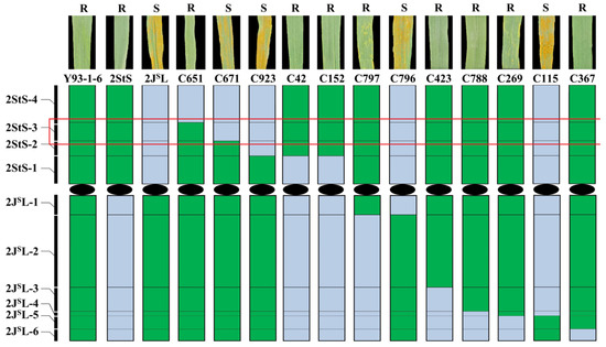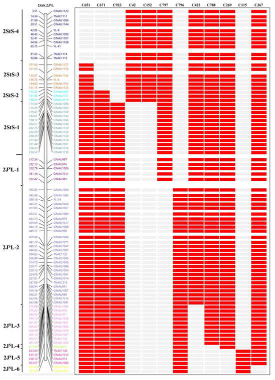Subsequently, all the 2StS.2JSL-specific markers were used to determine the breakpoints of the 12 homozygous 2StS.2JSL translocation and deletion lines. Among them, five translocation lines (C651, C671, C923, C42 and C152) included four different 2StS chromosomal bins. Line C651 contained bins 2StS-1-2StS-3 (92.88–232.65 Mb); Line C671 included bins 2StS-1-2StS-2 (151.15–232.65 Mb); Line C923 contained bin 2StS-1 (168.63–232.65 Mb); Line C42 and line C152 had the same breakpoints at bins 2StS-2-2StS-4 (0–174.64 Mb). The other five translocation lines and three deletion lines could divide 2JSL into six bins. The representative markers for different breakpoint types are shown in Figure 4. For example, 2StS.2JSLdel-1 and 2StS.2JSLdel-2 showed similar hybridization patterns with probes Oligo-pTa535 and Oligo-6S111; however, PCR amplification revealed that the distance of breakpoint positions between the two lines was more than 43.08 Mb. Thus, the markers could be anchored into ten cytological bins of chromosome 2StS.2JSL according to the amplification results: four for the short arm (2StS-1–2StS-4) and six for the long arm (2JSL-1–2JSL-6) (Figure 5). The constructed physical map was further used to map the stripe rust resistance locus on chromosome 2StS.2JSL.