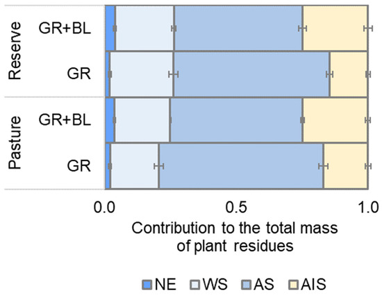 The non-polar extractive (NE), water-soluble (WS), acid-soluble (AS), and acid-insoluble (AIS) fractions of the plant residues used in the experiment: subalpine grass (GR) and a mixture of GR and birch leaves (GR + BLs) collected from reserved and grazed mountain slopes. Mean ± standard error for n = 3.