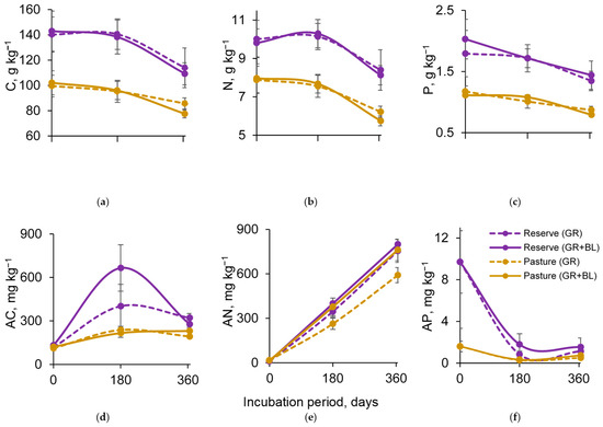 Dynamics of total carbon (a), nitrogen (b), and phosphorus (c) contents and their available forms (d–f) in soils of subalpine reserved and grazed meadows under the mineralization of grass (GR) and mixed residues of GR and birch leaves (GR + BLs). Mean ± standard error for n = 3.