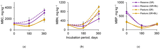 The addition of BLs to the reserved meadow soil resulted in a 13–31% reduction in MBC and a 31–37% reduction in MBN (Figure 3a,b; Table S1). The same trend was found for MBN in the grazed meadow soil (reduction of up to 19–67%). Plant residue quality had a lesser effect on soil MBP content, with a reduction trend observed in the reserved meadows (12%) after 1 year of decomposition and in grazed meadows (15–38%) for both incubation periods.
