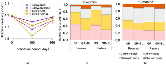 Shannon diversity index (a) and the averaged contribution of microbial respiration response to organic substrates in total substrate-induced respiration (SIR) after 6 (b) and 12 (c) months of decomposition of grass (GR) and mixed residues of GR and birch leaves (GR + BLs) in meadow soil samples collected from reserved and grazed mountain slopes. Mean ± standard error for n = 3.