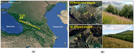 Scheme of location (a) and general view (b) with the study sites (yellow mark) in the reserved and grazed slopes of the northwestern Caucasus, Russia.