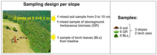 In early September 2022, we collected soil samples (0–10 cm depth) and aboveground biomass of herbaceous species (GR residue) from four 0.5 × 0.5 m plots spaced 3 m apart and located 50 m from the treeline within each slope (Figure 6). Soil samples were obtained for each plot after a geobotanical survey and cutting of aboveground biomass. The characteristics of the grass cover on the plots are given in Table 2. BLs were collected at the treeline close to sampling sites. For each slope, samples from the four plots were composited, yielding one composite soil sample, one GR residue sample, and one BL sample per slope (six slopes total). Soil samples were sieved (3 mm mesh) and stored at +4 °C for less than 1 month before the experiment. Plant materials were air-dried and mechanically processed into 5–10 mm fragments. Before experimental use, soil samples were moistened to 65% water-holding capacity, while air-dried plant residues were moistened to 400% (as determined in preliminary test).