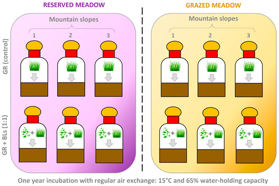 Prepared soil samples (300 mL) from each mountain slope were placed in 1 L vessels in two variants: (1) addition of prepared GR residues (control) and (2) addition of a 1:1 GR + BLs mixture to simulate treeline encroachment (Figure 7). Plant residues were mixed with soil at a 3:100 ratio (residue–soil; air-dried weight) to simulate plant residue inputs for three growing seasons. This proportion of plant residues was determined based on our previous findings regarding aboveground biomass incorporation in subalpine meadows [38]. The soil–residue mixtures were hermetically sealed in vessels and incubated in the dark at 15 °C for one year, with periodic aeration. The incubation temperature was selected to match growing season conditions, as determined using air temperature data (2020–2021) collected at the study sites using DS1922L-F5 iButton® loggers (Maxim Integrated, San Jose, CA, USA). Initial soil chemical and microbial properties were analyzed prior to residue addition, at the ‘0 moment’ of the experiment. Subsequent analyses were performed after 6 and 12 months of incubation to assess treatment effects on soil properties.