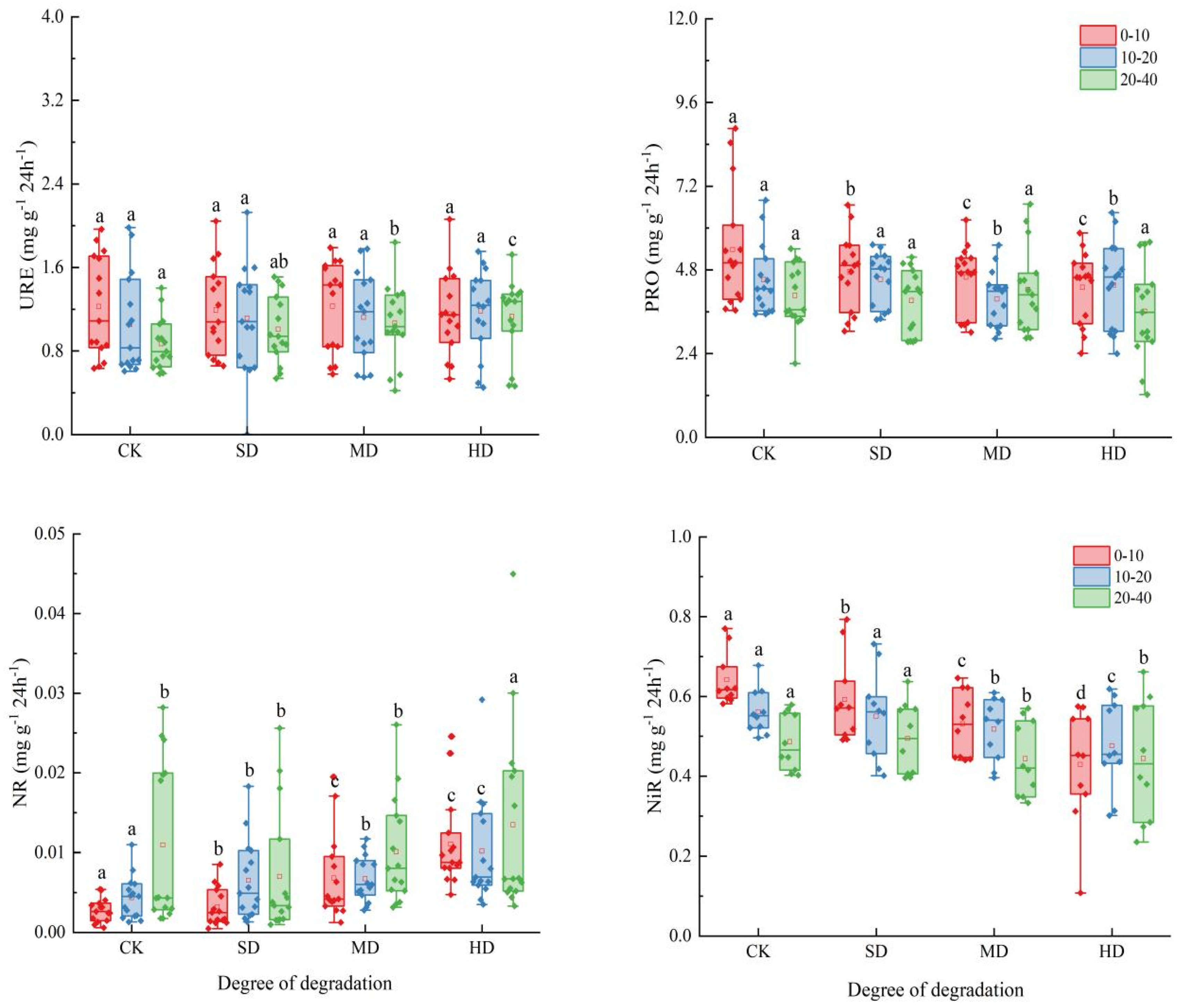 2.4. Correlation Between Soil Nitrogen Components and Enzyme Activity Under Vegetation Degradation