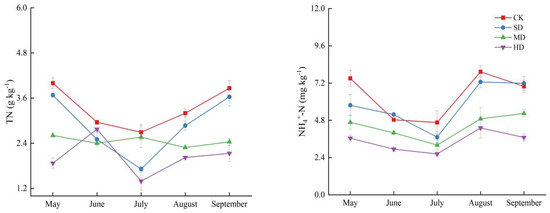 Characteristics of soil nitrogen components during the vegetation growth season in the process of vegetation degradation. CK: non-degraded vegetation; SD: slightly degraded vegetation; MD: moderately degraded vegetation; and HD: heavily degraded vegetation.
