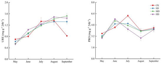 Soil nitrogen cycling enzyme activities exhibited fluctuating changes at different plant growth stages under the influence of vegetation degradation (Figure 5). The study found that soil URE activity at all four degradation levels increased during the vegetation growth season, reaching its maximum in August (1.36, 1.32, 1.49 mg g−1 24 h−1) for all levels except MD. The seasonal variation of PRO at each degradation level showed the trend of an initial increase, followed by a decrease, and then another increase. However, the maximum PRO activity for SD, MD, and HD occurred in June (5.38, 5.63 mg g−1 24 h−1); for CK, the maximum was observed in July (5.01 mg g−1 24 h−1). NR and NiR exhibited significant seasonal fluctuations; the trends of change were generally consistent across all degradation levels. NR showed a pattern of initial decrease, followed by an increase, then another decrease, and finally another increase. In contrast, NiR exhibited a trend opposite to that of NR. The minimum value of NR appeared in June (0.0022, 0.0019, 0.034, 0.0055 mg g−1 24 h−1) and NiR reached its peak in August (0.63, 0.67, 0.57, 0.60 mg g−1 24 h−1). Additionally, vegetation degradation, the growth season, and the interaction between vegetation degradation and growth season significantly affected soil nitrogen-related enzymes (p < 0.01) (Table 1).