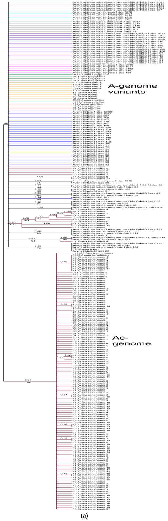 - Yan, H.-H.; Baum, B.R.; Zhou, P.-P.; Zhao, J.; Wei, Y.-M.; Ren, C.-Z.; Xiong, F.-Q.; Liu, G.; Zhong, L.; Zhao, G.; et al. Phylogenetic analysis of the genus Avena based on chloroplast intergenic spacer psbA-trnH and single-copy nuclear gene Acc1. Genome 2014, 57, 267–277. [Google Scholar] [CrossRef]