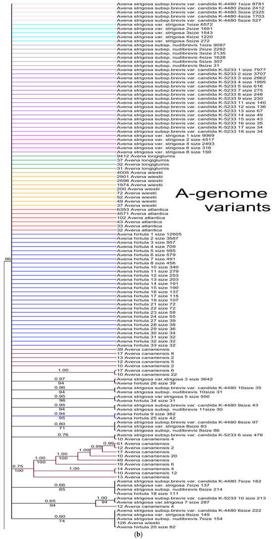 - Badaeva, E.D.; Shelukhina, O.Y.; Goryunova, S.V.; Loskutov, I.G.; Pukhalskiy, V.A. Phylogenetic relationships of tetraploid AB genome Avena species evaluated by means of cytogenetic (C-banding and FISH) and RAPD analyses. J. Bot. 2010, 2010, 742307. [Google Scholar] [CrossRef]