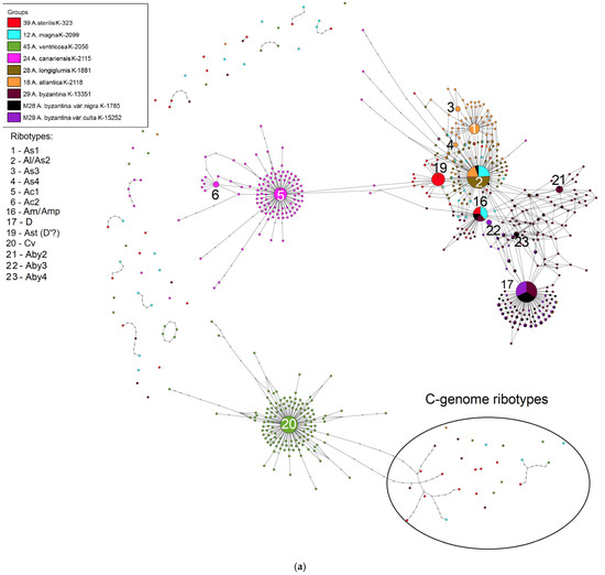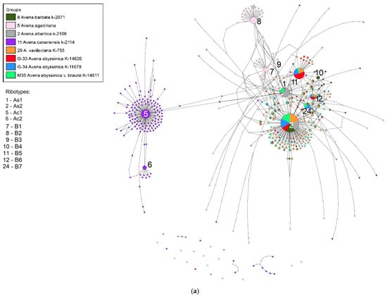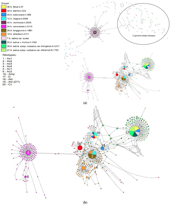 - Gnutikov, A.A.; Nosov, N.N.; Loskutov, I.G.; Blinova, E.V.; Shneyer, V.S.; Rodionov, A.V. Origin of Wild Polyploid Avena Species Inferred from Polymorphism of the ITS1 rDNA in Their Genomes. Diversity 2023, 15, 717. [Google Scholar] [CrossRef]
