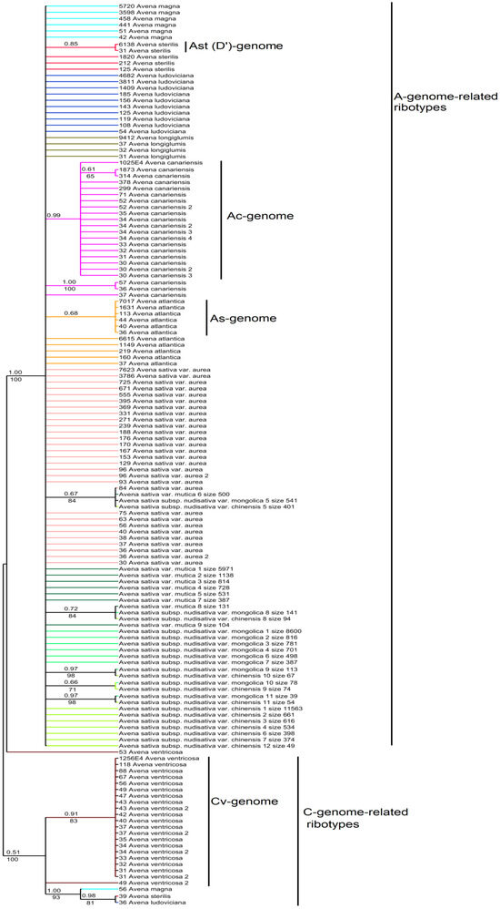 - Gnutikov, A.A.; Nosov, N.N.; Loskutov, I.G.; Machs, E.M.; Blinova, E.V.; Probatova, N.S.; Langdon, T.; Rodionov, A.V. New insights into the genomic structure of the oats (Avena L., Poaceae): Intragenomic polymorphism of ITS1 sequences of rare endemic species Avena bruhnsiana Gruner and its relationship to other species with C-genomes. Euphytica 2022, 218, 3. [Google Scholar] [CrossRef]