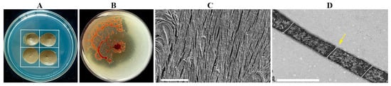 The strain NSD29, an isolate obtained during myxobacteria isolation (Figure 1A), exhibited distinctive phenotypic characteristics. On VY/2 agar, colonies were initially moist, developing an orange pigmentation with prolonged incubation. Colony morphology displayed a spreading, “membranous” growth pattern, characterized by the formation of aggregated mounds or flame-like protrusions at the colony margin, interconnected by a network of veins (Figure 1B). Light microscopy revealed cells as unbranched filaments exceeding 100 μm in length, composed of chains of bacilli. With culture maturation, these filaments fragmented into individual cells. Scanning electron microscopy (SEM) confirmed the filamentous morphology of individual cells (Figure 1C). Transmission electron microscopy (TEM) further revealed that cells were arranged in extended chains, delineated by distinct cell walls (Figure 1D).