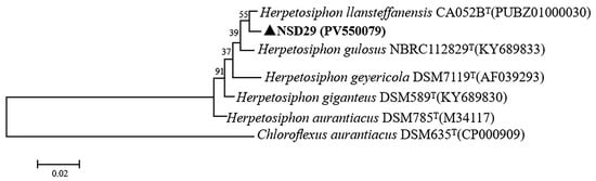 Phylogenetic analysis of the strain NSD29 based on 16S rRNA gene sequences. Chloroflexus aurantiacus DSM 635ᵀ (CP000909), a member of the class Chloroflexota, was used as the outgroup.