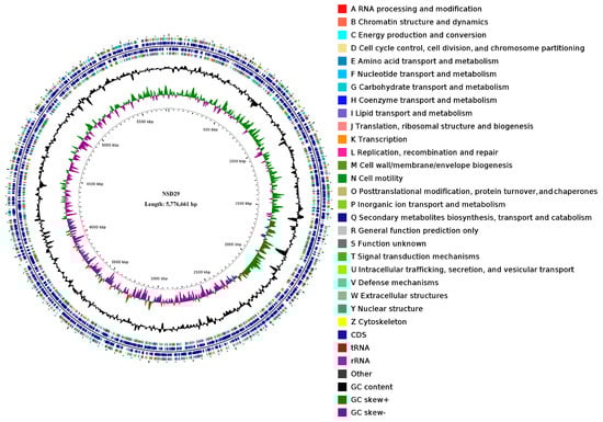 Whole-genome sequencing of the strain NSD29 was performed using the Illumina NovaSeq platform (Nanjing Personal Gene Technology Co., Ltd., Nanjing, China) with 2 × 150 bp paired-end sequencing. Raw reads were trimmed to remove sequencing adapters using A5-MiSeq (v20160825) []. Genome assembly was performed using SPAdes (v3.15.4) []. The assembled genome was subjected to base correction using Pilon (v1.24) []. Protein-coding genes were predicted using GeneMarkS (v4.32) software [] and functionally annotated using EggNOG-mapper []. Transfer RNAs (tRNAs), ribosomal RNAs (rRNAs), and other non-coding RNAs were predicted using tRNAscan-SE (v2.0) [], Barrnap (v0.9), and the Rfam database (v14.1) [].