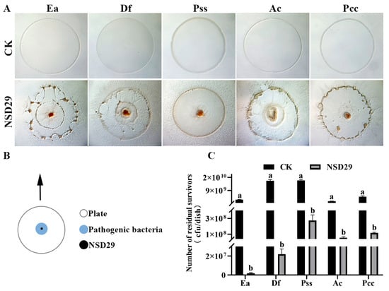 Predatory activity of the strain NSD29 against multiple plant pathogenic bacteria. (A) Predation assay setup: 30 µL suspensions of target prey bacteria (OD600 = 1.0) were spotted onto TPM agar to create prey lawns and allowed to dry for 30 min. Subsequently, a 2 µL drop of strain NSD29 suspension (OD600 = 1.0) was placed at the center of each prey lawn. (B) Schematic representation of the predation process. (C) Quantification of predation efficiency, determined by scraping the bacterial lawn, serially diluting, and plating to enumerate viable pathogenic bacteria. For panels (A,C), “CK” denotes the control group inoculated only with the pathogen. Ea: Erwina amylovora; Df: Dickeya fangzhongdai; Pss: P. syringae pv. Syringae; Ac: Acidovorax citrulli; and Pcc: Pectobacterium carotovorum subsp. carotovorum. Error bars represent the standard error of the mean (n = 3). Statistical significance was assessed using Duncan’s multiple range test (p < 0.05). Treatments sharing the same letter are not significantly different.