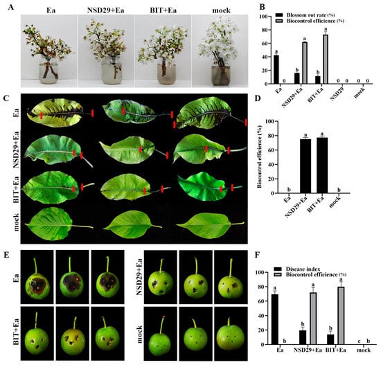 Bioassay of NSD29 in controlling fire blight on pear blossoms, leaves, and fruits. (A) Control of fire blight on detached pear blossoms by the tested strain NSD29 (5 dpi). NSD29/BIT + Ea represents the protective treatment, where NSD29 and BIT were inoculated 24 h before Ea; mock: sterile water; Ea: inoculation with E. amylovora only; NSD29: inoculation with the strain NSD29 only; and BIT: inoculation with benziothiazolinone. (B) Biological control effect of the strain NSD29 on fire blight of pear blossoms (5 dpi). (C) Control of fire blight on detached pear leaves by the tested strain NSD29 (5 dpi). On the same leaf, the two short red lines define the expanded distance of the disease symptom along the vein. (D) Biological control effect of the strain NSD29 on fire blight of pear leaves (5 dpi). (E) Control of fire blight on detached pear fruits by the tested strain NSD29 (5 dpi). (F) Biological control effect of the strain NSD29 on fire blight of pear fruits (5 dpi). NSD29/BIT + Ea represents the protective treatment, where NSD29 and BIT were inoculated 24 h before Ea; mock: sterile water; Ea: inoculation with E. amylovora only; and BIT: inoculation with benziothiazolinone. Different lowercase letters (a, b, c) in panels (B,D,F) indicate a significant difference at p = 0.05.