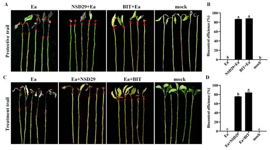 Biocontrol efficacy of the strain NSD29 against fire blight on detached pear branches. (A) Representative images of the protective assay on pear branches 7 days after inoculation (dpi). (B) Quantification of the protective biocontrol efficacy on detached pear branches. (C) Representative images of the curative assay on pear branches 7 dpi. (D) Quantification of the curative biocontrol efficacy on detached pear branches. Protective treatment: NSD29 + Ea and BIT + Ea (NSD29 or benziothiazolinone applied 24 h before E. amylovora). Curative treatment: Ea + NSD29 and Ea + BIT (E. amylovora inoculated 24 h before NSD29 or benziothiazolinone). Control: Ea (pathogen only). On the same shoot, the two short red lines define the expanded distance of the disease symptom from the inoculation site. Different lowercase letters (a, b, c) in panels (B,D) indicate a significant difference at p = 0.05.
