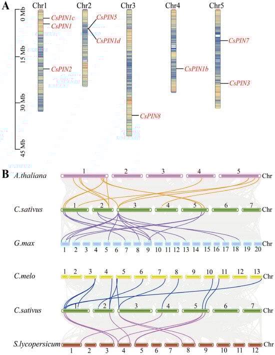Chromosomal mapping and colinearity analysis of CsPIN genes. (A) Chromosomal localization. Mb: megabase. The different colors on the chromosome represent the gene density. (B) Collinearity analysis. Highlight lines: syntenic PIN gene pairs; Gray: collinear blocks.