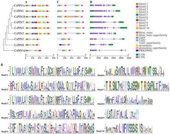 Conserved motifs (A,B), gene structure (C), and exon–intron structure (D) of CsPINs. Colored boxes of different lengths represent different conserved motifs, and letters in different colors mean the sequences of the conserved motifs.