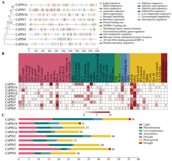 Analysis of cis-acting regulatory elements of the CsPIN genes. (A) The cis-acting elements distribution in the promoters of CsPINs. (B,C) The names and numbers of cis-acting elements in the promoters of each CsPIN gene.
