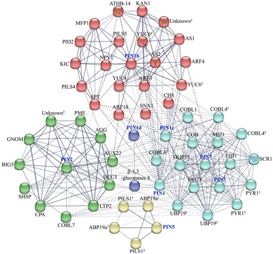 Protein–protein interaction analysis of CsPINs proteins. Abbreviations: ABP19a: auxin-binding protein ABP19a; AGG: agglutinin domain-containing protein; ARF: auxin response factor; AS1: transcription factor AS1; AS2: protein ASYMMETRIC LEAVES 2; ATHB-14: homeobox-leucine zipper protein ATHB-14; AUX22: auxin-induced protein AUX22-like; BIG5: brefeldin A-inhibited guanine nucleotide-exchange protein 5 isoform X1; β-1,3-glucanases 8: glucan endo-1,3-beta-glucosidase 8; CHS: chalcone synthase; COB: protein COBRA; COBL: COBRA-like protein; CPA: F-actin-capping protein subunit alpha; EID1: phytochrome A-associated F-box protein; GNOM: ARF guanine-nucleotide exchange factor GNOM; KAN1: transcription repressor KAN1 isoform X1; KIC: calcium-binding protein KIC; LTP2: non-specific lipid-transfer protein 2; MFP1: MFP1 attachment factor 1; MIZ1: protein MIZU-KUSSEI 1; NPY1: BTB/POZ domain-containing protein NPY1; OFUT: O-fucosyltransferase family protein; PILS: auxin transporter-like protein; PID2: protein kinase PINOID 2; PME: pectinesterase; PYR1: abscisic acid receptor PYR1; SCR1: protein SCARECROW 1; SHSP: SHSP domain-containing protein; SKIP35: ankyrin repeat protein SKIP35; SNX1: sorting nexin 1; SPT: sugar phosphate transporter domain-containing protein; UBP19: ubiquitin-specific protease family C19-related protein; UCC3: uclacyanin-3; Unknown: uncharacterized protein; YUC: indole-3-pyruvate monooxygenase YUCCA. Protein names marked with numbers were assigned based on BLAST alignments (NCBI) to identify entries with identical names but distinct gene IDs.