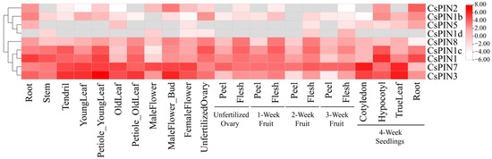 To elucidate the role of CsPIN genes in cucumber growth and development, we obtained RNA sequencing data for CsPIN gene expression profiles across 23 distinct tissues from the CuGenDB database v2.0 (biological project PRJNA312872) available at the website (http://cucurbitgenomics.org). As shown in Figure 6, except for CsPIN1d, the other eight CsPIN genes were all up-regulated in roots, among which CsPIN1 had the highest expression level in roots. Except for CsPIN1b, CsPIN1d, CsPIN2, and CsPIN5, the other five CsPIN genes were expressed in all 23 different tissues. CsPIN1b was not expressed in the male flowers and pericarp of 2-week-old fruits. CsPIN1d was specifically expressed in the stem, male flowers, female flowers, unpollinated ovaries, 2-week-old fruit flesh, and 3-week-old fruit flesh. CsPIN2 was specifically expressed in the roots, male flowers, male flower buds, female flowers, hypocotyls, and roots of 4-week-old seedlings. CsPIN5 was specifically expressed in the roots, old leaves, and roots of 4-week-old seedlings. CsPIN7 was highly expressed in all 23 tissues. Except for CsPIN1d and CsPIN5, the expression levels of all CsPIN genes in young leaves were higher than those in old leaves, indicating that CsPIN plays an important role in the early growth and development of leaves. These results indicate that the expression of CsPIN genes shows obvious tissue specificity.