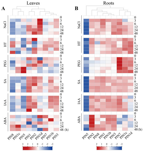 Heatmap of qPCR-based expression patterns of CsPIN genes in cucumber leaves and roots under abiotic stress and hormone treatment. The relative expression level was calculated by 2−ΔΔCT method compared with EF1 alpha (CsaV3_2G011610) as a reference gene.