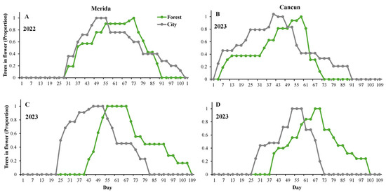 Flowering phenology of Ceiba pentandra in two localities in the Yucatan Peninsula (Merida (A,C) and Cancun (B,D)) recorded over two consecutive flowering seasons (2022 (A,B) and 2023 (C,D)). The lines show the number of flowering trees in two habitats: forest (in green) and city (gray). The horizontal axis shows the Julian day, in which December 1st = day 1.