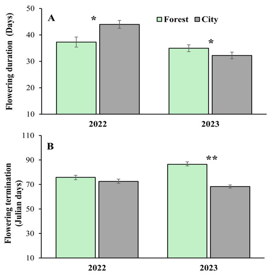 Flowering duration (A) and date of flowering termination (B) in Ceiba pentandra in two contrasting habitats (forest and city) over two consecutive reproductive seasons (years 2022 and 2023). The bars denote mean values ± 1SE. The asterisks indicate that the means differ statistically (* p < 0.05; ** p < 0.01).