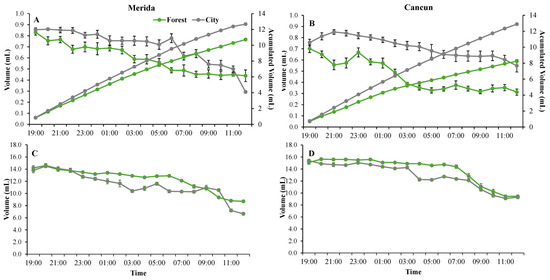 Nectar production in flowers of Ceiba pentandra in two contrasting habitats (forest and city) in two sites in the Yucatan Peninsula: Merida (A) and Cancun (B). Values of nectar volume, measured every hour, are shown along the main axis, while the accumulated volume is shown along the secondary axis. Values of nectar concentration in the forest and city in Merida (C) and Cancun (D) are also shown. All data are mean values. When shown, error bars denote ± 1SE.