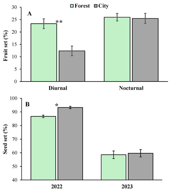 (A) Fruit set of Ceiba pentandra attributed to diurnal (Diurnal) and nocturnal pollinators (Nocturnal) in two contrasting habitats (forest and city) in the Yucatan Peninsula. (B) Seed set of Ceiba pentandra in two contrasting habitats (forest and city) over two consecutive reproductive seasons (years 2022 and 2023). The bars show mean values ± 1SE. The asterisks indicate statistically different pairs of means (* p < 0.05; ** p < 0.01).