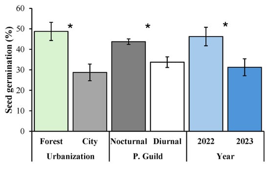 Germination of Ceiba pentandra seeds from different habitats (forest vs. city) pollinated by different pollinator guilds (nocturnal vs. diurnal) and over two different years (2022 and 2023). The bars show mean values ± 1SE. The asterisks indicate statistically different pairs of means (* p < 0.05) for each factor: urbanization, pollinator guild (P. guild), and year.