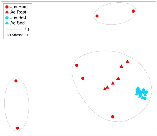 - Ettinger, C.L.; Voerman, S.E.; Lang, J.M.; Stachowicz, J.J.; Eisen, J.A. Microbial communities in sediment from Zostera marina patches, but not the Z. marina leaf or root microbiomes, vary in relation to distance from patch edge. PeerJ 2017, 5, e3246. [Google Scholar] [CrossRef] [PubMed]
