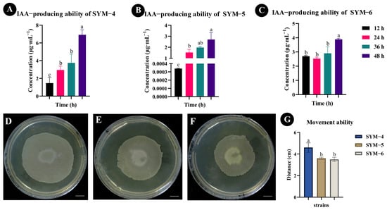 Determination of IAA-producing ability and movement ability of the strains. (A–C) Qualitative and quantitative analyses of IAA-producing ability of different bacterial strains. (D–F) Qualitative diagram of the movement ability of SYM-4, SYM-5, and SYM-6. (G) Quantitative analysis of the movement ability of SYM-4, SYM-5, and SYM-6. Scale bar = 1 cm. The different small letters represent significant differences at the p < 0.05 level.