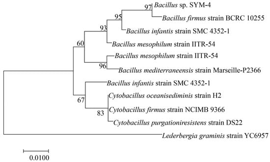 Phylogenetic tree reconstructed using DNA sequences from Bacillus sp. SYM-4 and sequences downloaded from NCBI.