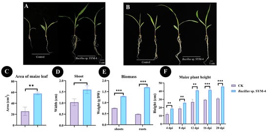 Maize seedlings were inoculated with Bacillus sp. SYM-4 and grown in pots, with seedlings treated with LB medium as the control group. After inoculation with Bacillus sp. SYM-4, the leaf area and stem diameter of maize seedlings were significantly higher than those of maize seedlings in the control group, with values of 57.78 ± 2.36 cm2 and 1.60 ± 0.17 cm in the inoculated group, respectively. Compared with the control group, maize seedlings inoculated with Bacillus sp. SYM-4 showed 56.01 ± 5.92% and 34.44 ± 9.08% increases in leaf area and stem diameter, respectively (Figure 3C,D).