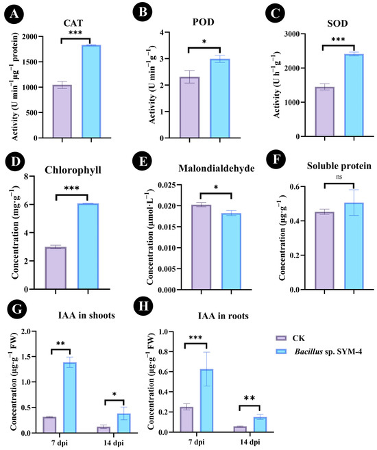 Effect of inoculation with Bacillus sp. SYM-4 on physiological and biochemical parameters in maize seedlings. (A–C) Effect of SYM-4 on the antioxidant enzyme activity of maize seedlings at 14 dpi. (D–F) Effect of SYM-4 on the chlorophyll content, malondialdehyde, and soluble protein of maize seedlings at 14 dpi. (G) Effect of SYM-4 on IAA content in shoots of maize seedlings at 7 dpi and 14 dpi. (H) Effect of SYM-4 on IAA content in roots of maize seedlings at 7 dpi and 14 dpi. Triple asterisks indicate significant differences between the control group and other treatments, *** p < 0.001, ** p < 0.05, * p < 0.01.