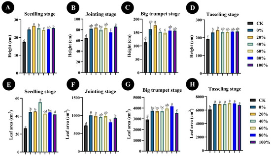 Plant height (A–D) and leaf area (E–H) of maize seedlings at four growth stages in the field, following application of fertilizer, where different proportions (0%, 20%, 40%, 60%, 80%, or 100%) of chemical fertilizer were replaced with microbial fertilizer (SYM-4). The legend shows the percentage of chemical fertilizer replaced by microbial fertilizer in each treatment. Mean differences were compared using one-way ANOVA with Tukey’s test. The different small letters represent significant differences at the p < 0.05 level. The results shown represent the means ± standard deviation.