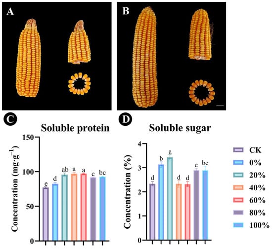 The effects of replacement of different proportions of chemical fertilizer with microbial fertilizer on maize kernels and panicles. The effects of control group (A) and 20% Bacillus sp. SYM-4 microbial fertilizer replacement of chemical fertilizer (B) on corn. The concentrations of soluble protein (C) and soluble sugars (D) in the maize kernels were determined. In panels C and D, the legend shows the proportions (0%, 20%, 40%, 60%, 80%, or 100%) of chemical fertilizer replaced by microbial fertilizer. Scale bar = 1 cm. Mean differences were compared using one-way ANOVA with Tukey’s test. The different small letters represent significant differences at the p < 0.05 level. The results shown represent the means ± standard deviation.