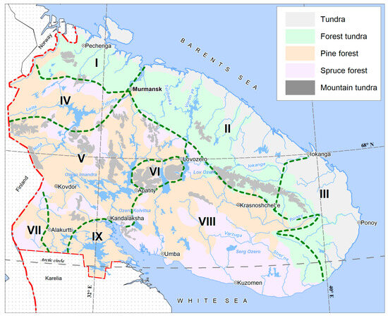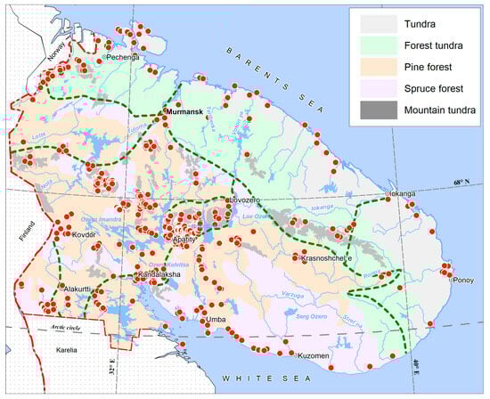 - Borovichev, E.A.; Demakhina, T.V.; Denisov, D.B.; Isaeva, L.G.; Kozhin, M.N.; Konoreva, L.A.; Konstantinova, N.A.; Kopeina, E.I.; Koroleva, N.E.; Mamontov, Y.S.; et al. Materials on Keeping the Red Book of the Murmansk Region; KaRC RAS: Petrozavodsk, Russia, 2019; pp. 1–101. [Google Scholar]