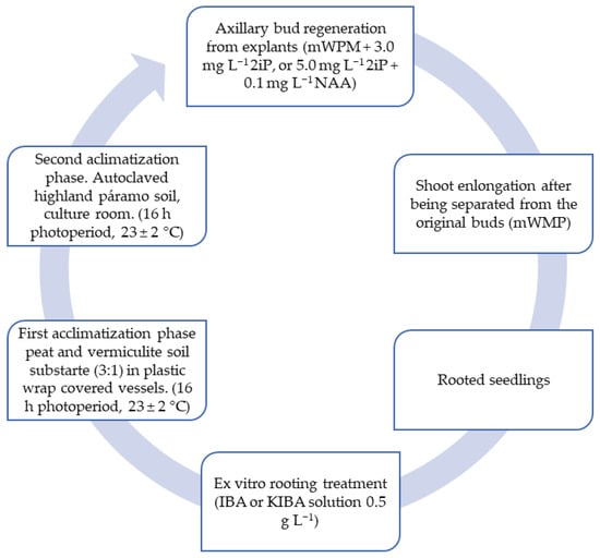 Regarding the regeneration of axillary buds and the elongation of apical stem segments, the mWPM culture medium with growth regulators 2IP and NAA at a concentration of 5.0 mg L−1 and 0.1 mg L−1, respectively, was used, maintaining a temperature of 23 ± 2 °C and a photoperiod of 16 h for 16 weeks. The regeneration rate was 36%, with an average of 9 shoots per bud and a shoot size of 18.13 mm. In the rooting phase, IBA/KIBA with a concentration of 0.5 g L−1 was used, with an incubation temperature of 18 °C for 24 h, achieving a survival rate of 46.67%. During the first acclimatization phase, a substrate of peat and vermiculite was used in a 3:1 ratio, with a photoperiod of 16 h, a temperature of 23 ± 2 °C and relative humidity between 30 and 90%, achieving a survival rate of 93.75% in a period of 6 to 8 months. In the second acclimatization phase, moorland soil was used under the same photoperiod and temperature conditions.