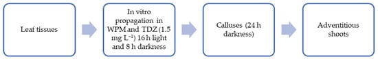 Leaf tissue was provided with the WPM culture medium combined with TDZ; it was observed that the oxidation of leaf tissue affected an average of 1.16 leaves. In addition, 90% callus formation was achieved, and adventitious shoot emergence occurred within 10 days. The plants were exposed to a photoperiod of 16 h of light daily, which contributed to the observed results. These findings highlight the efficacy of the WPM+TDZ growing medium in promoting callus formation and adventitious shoot development under controlled light conditions.